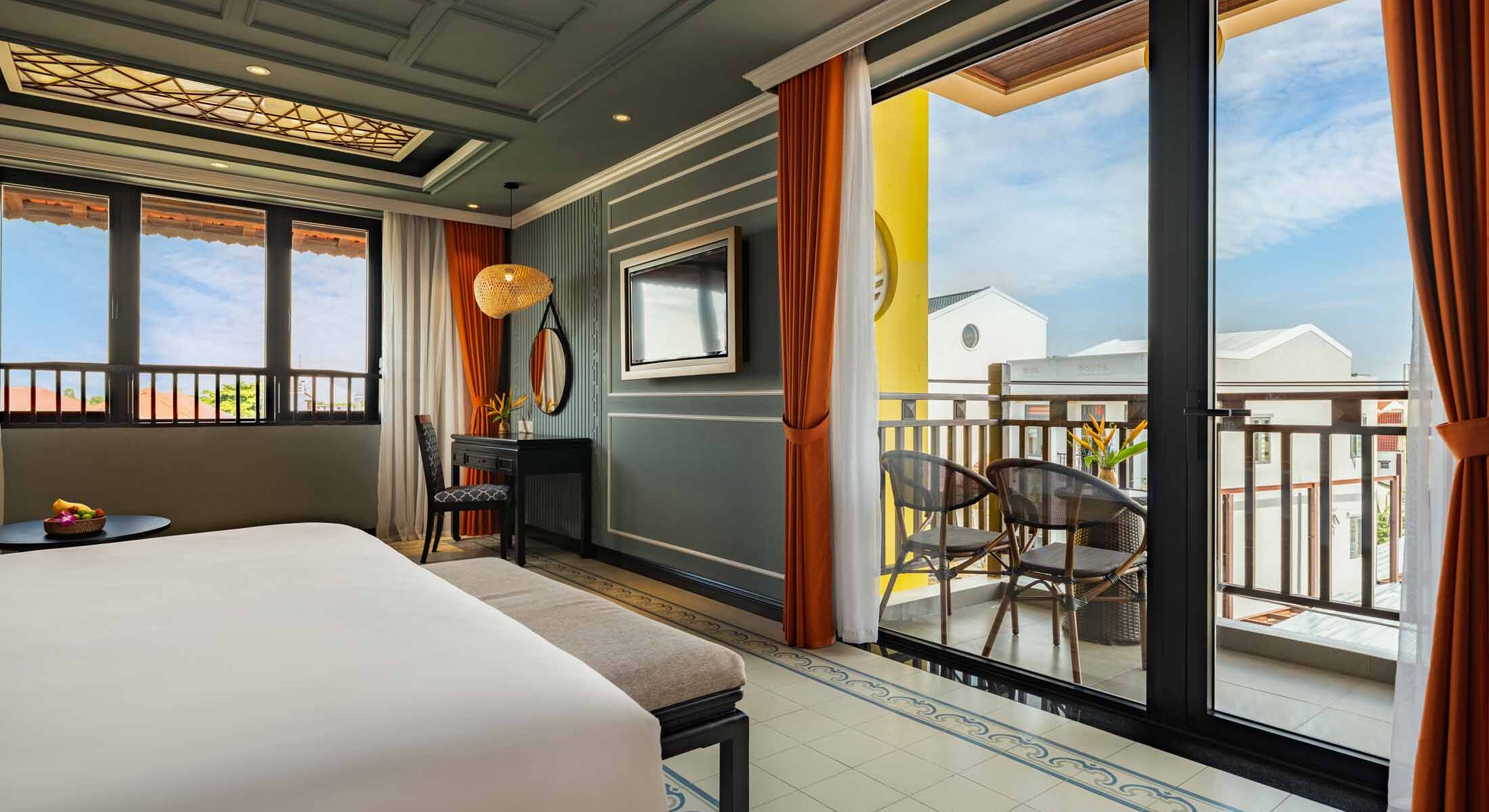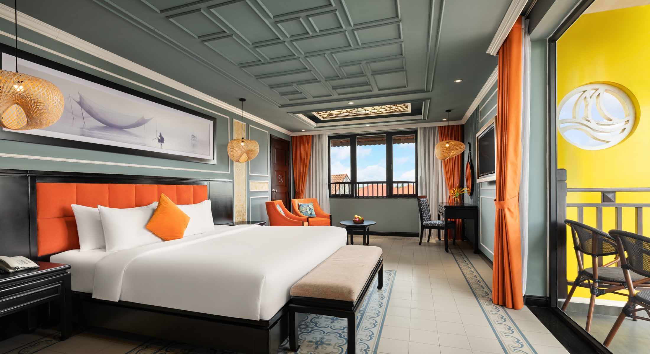 Sự yên bình đến từ ban công riêng thoáng đãng nhìn ra những mái nhà thơ mộng của Hội An. Căn phòng thanh lịch mang nét duyên dáng đặc trưng của Hội An, cùng với khu vực tiếp khách lý tưởng để ngồi nhâm nhi tách trà hoặc đơn giản là tận hưởng khung cảnh của phố cổ Hội An.